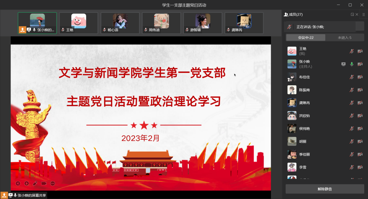 2月24日,文新学院学生一支部通过线上会议召开2月份的主题党日活动暨政治理论学习,会议由支部书记张小焕老师主持。