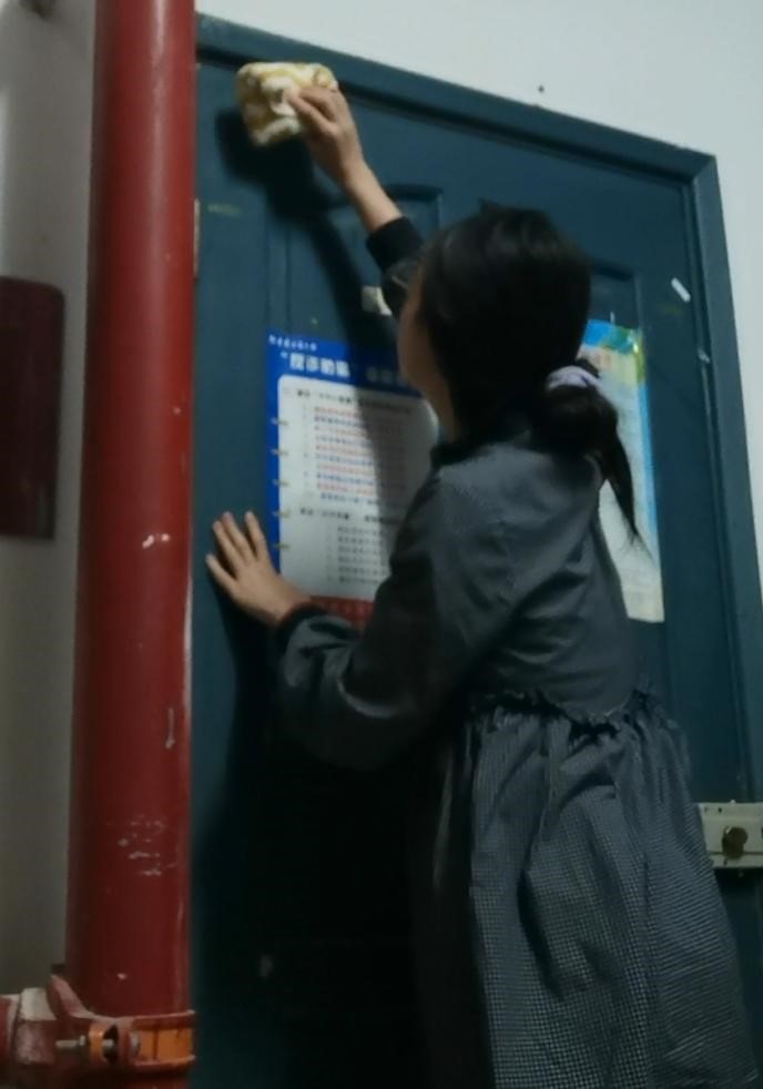 刘蜜正在擦拭寝室门