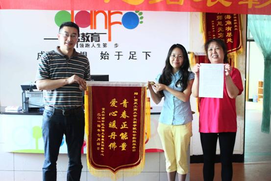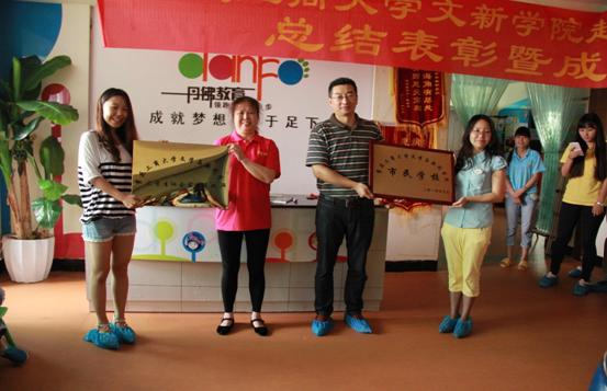 ??? ?7月4日上午,实践服务团在丹佛儿童康复训练中心举行了成果展示暨总结表彰大会,服务团成员表演舞蹈节目,孩子们也在老师的带动下跳了平时教授的舞蹈,还让孩子家长们同孩子一起做了亲子节目。在大会上文新学院党总支副书记李华平和丹佛儿童康复训练中心负责人赵老师、张老师一同举行了挂牌仪式,丹佛负责人赵老师与张老师还为服务团送上了锦旗和感谢信以示感谢。