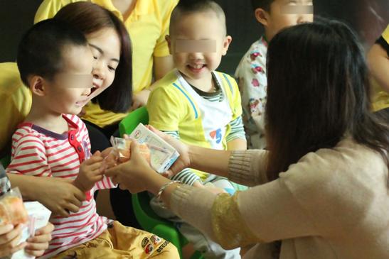 志愿者给小朋友发放牛奶和面包