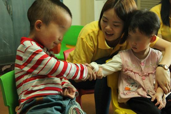 实践团成员引导小朋友学会握手