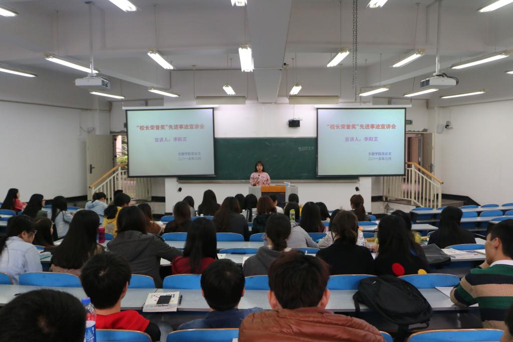 ,文学与新闻学院举办“学习先进经验,感受榜样力量”的主题宣讲会,活动邀请我校首届校长荣誉奖学金获得者2011级广电1班季阳芷同学作主题宣讲。学院党总支副书记李华平、13级辅导员肖婷老师、