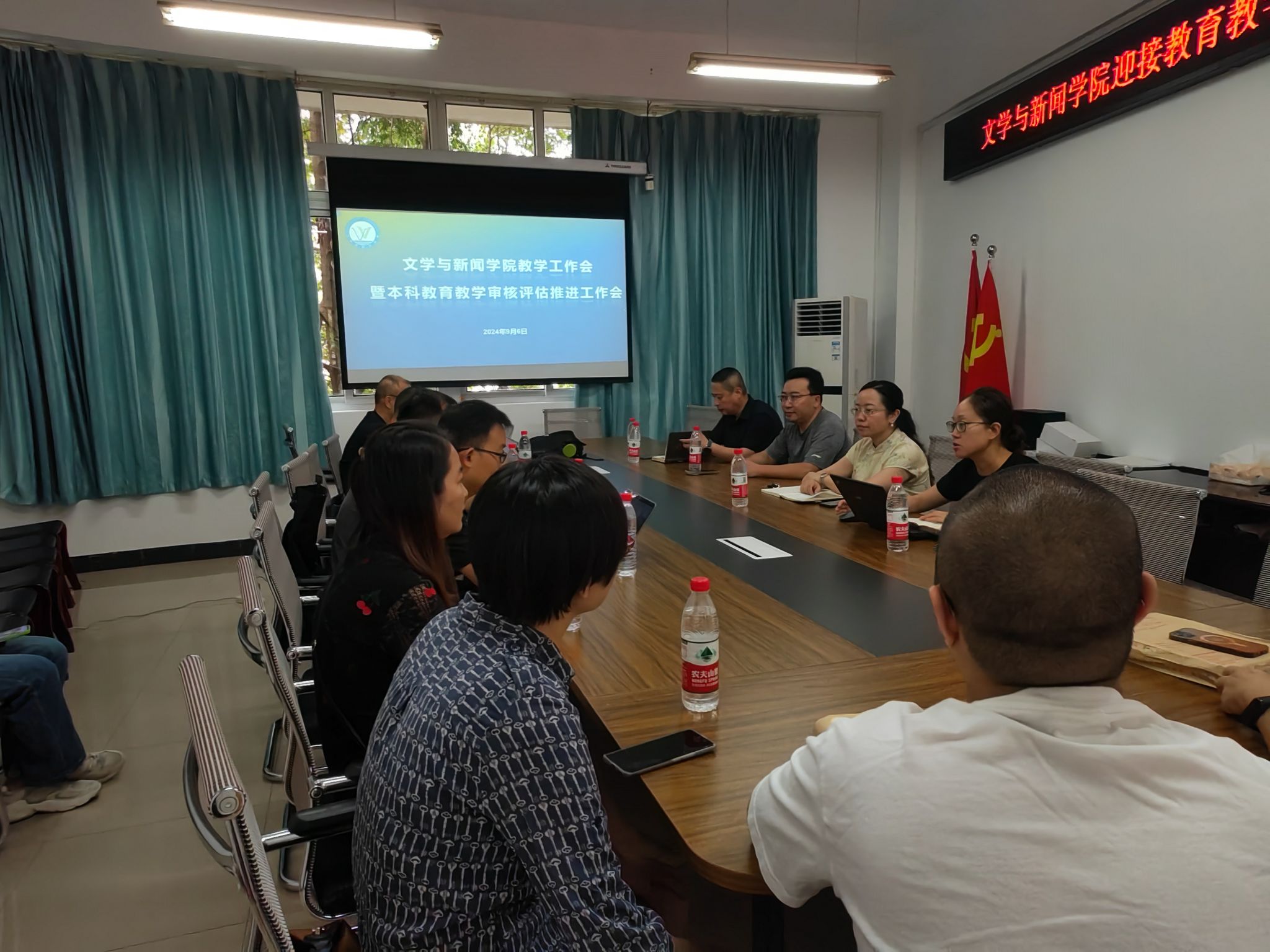 2024年9月6日上午,重庆工商大学文新学院为迎接本科教育教学审核评估工作,在慧智楼90528开展了新学期教学工作会,学院党委书记潘焱、院长殷俊、副书记程元元、副院长郑笑眉,系主任,院级督导,综合办负责人,实验室负责人及教务办相关人员参加会议。