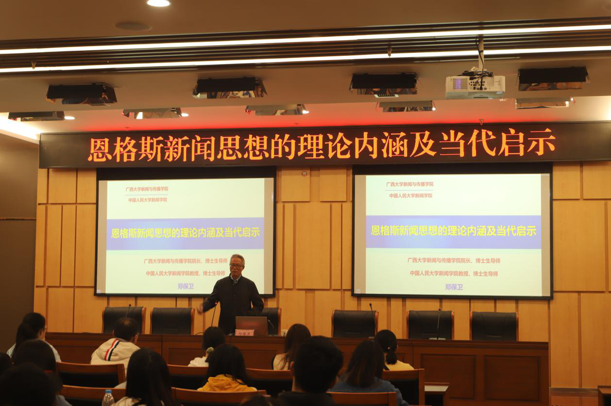 11月13日下午3点,著名新闻学专家、原全国新闻学研究会会长、教育部社会科学委员会委员兼新闻传播学科召集人、中国人民大学新闻学院教授、广西大学新闻传播学院院长郑保卫教授莅临我校,并在我校图书馆会议中心作了题为“恩格斯新闻思想的理论内涵及当代启示——纪念恩格斯诞辰200周年”的专题学术讲座。讲座由文学与新闻学院院长王仕勇教授主持。文学与新闻学院、马克思主义学院、重庆市高校网络舆情与思想动态研究咨政中心部分教师、学生聆听了讲座。