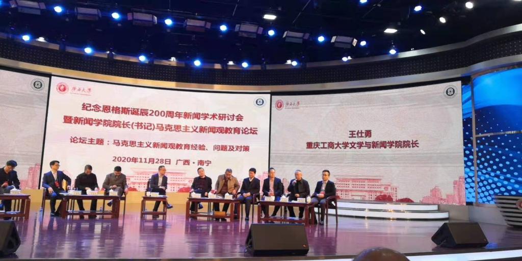 11月28日,“纪念恩格斯诞辰200周年新闻学术研讨会暨新闻学院院长(书记)马克思主义新闻观教育论坛”在广西大学隆重举行。此次研讨会由教育部社会科学委员会语言文学、新闻传播学和艺术学学部,广西大学新闻与传播学院、广西大学马克思主义新闻观研究中心联合中国人民大学、中国传媒大学、复旦大学、清华大学、北京大学、武汉大学、华中科技大学、暨南大学、厦门大学、湖南大学、上海大学、北京外国语大学、陕西师范大学等13所国内著名新闻学院以及马克思主义新闻观研究机构共同主办。我院院长王仕勇教授应邀参加研讨会及论坛,并在论坛上做主题发言。