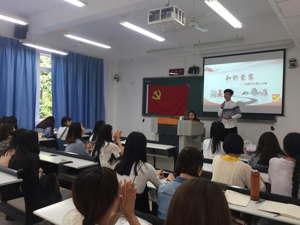 2018年4月27日,文新学院学生三支部在90402举办以“党的知识·在心间”为主题的党内知识竞赛活动。支部书记张静、全体党员、发展对象参加了此次竞赛活动。