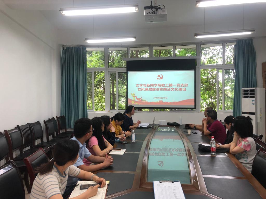 6月10日,文学与新闻学院教工第一党支部在90528会议室,组织本支部教职工党员推进党风廉政建设和廉洁文化建设,并学习相关党内法规准则,由支部书记欧婧主持。