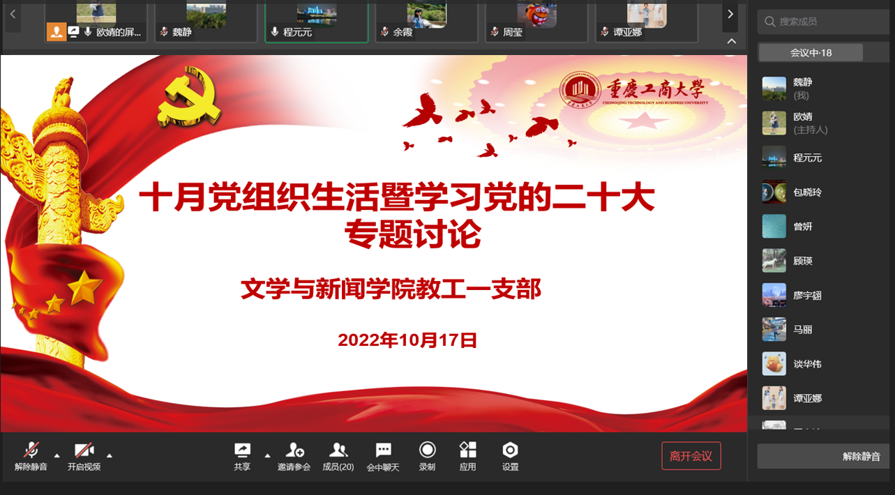 2022年10月16日上午10时,举世瞩目的中国共产党第二十次全国代表大会在人民大会堂隆重开幕。388vip太阳集团教工第一党支部的各位党员教师,第一时间以线上线下相结合的形式,及时收看了党的二十大开幕会盛况和习近平总书记代表第十九届中央委员会向大会作的报告。10月17日,教工一支部于企业微信群组织了10月党组织生活暨学习党的二十大专题讨论会,党员教师们纷纷表示感受到了总书记所作报告的强大鼓舞,备受振奋,积极发言,踊跃分享心得体会。