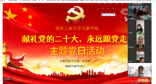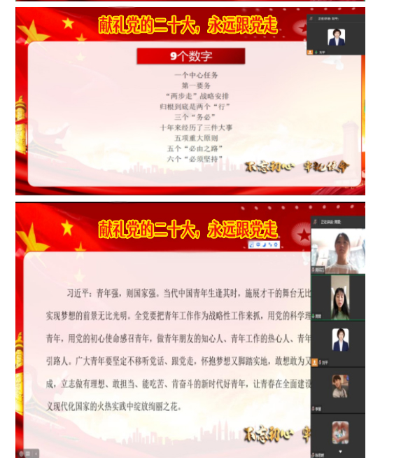 10月16日上午,中国共产党第二十次全国代表大会在北京人民大会堂隆重开幕,习近平总书记代表第十九届中央委员会向大会作了报告。为深入贯彻习近平新时代中国特色社会主义思想,深刻感悟新时代党和国家事业发展伟大成就的光辉历程,学院学生第二党支部于10月17日组织开展了“献礼党的二十大,永远跟党走”的线上主题学习活动,学院全体党员认真学习领会了党的二十大报告精神,会议由党支部书记刘平老师主持。