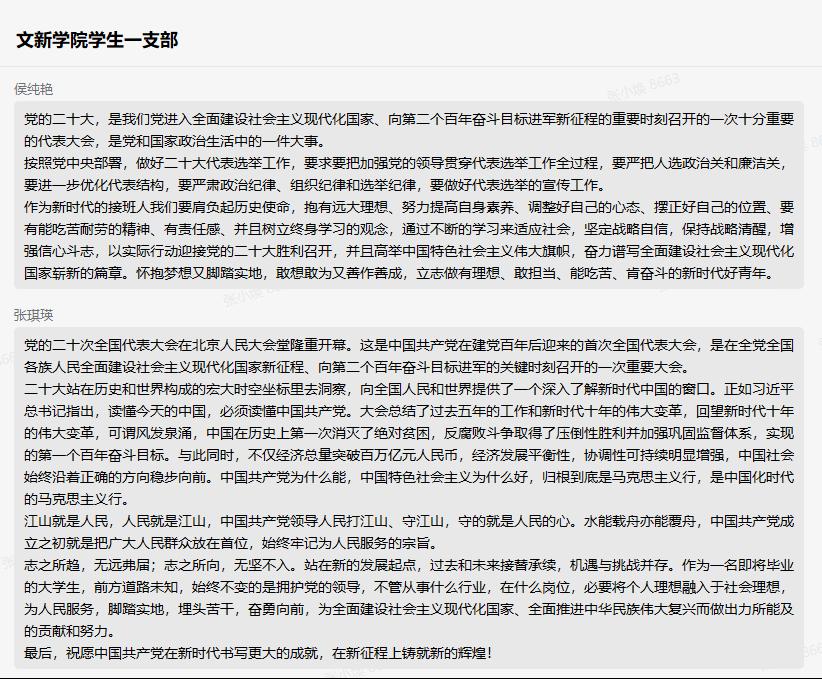 胡丽(支部党员,19广电一班同学):举世瞩目的中国共产党第二十次全国人民代表大会召开了,大会总结了过去五年的工作和新时代十年的伟大变革,向世界展示了中国发展取得的巨大成就,体现了中国共产党为中华人民谋幸福,为中华民族谋复兴的决心和能力。从党的十八大开始,中国特色社会主义进入新时代,到党的二十大,这十年,中国铸就了激荡人心的东方传奇,中华民族伟大复兴进入了不可逆转的历史进程。作为一名共产党员,我为党和国家取得的一系列成就感到骄傲,作为一名中国人,我更为祖国的繁荣昌盛感到自豪。接下来我将持续关注大会盛况,积极学习贯彻党的二十大精神。祝愿中国共产党在新的时代书写更大的荣光,铸就新辉煌!