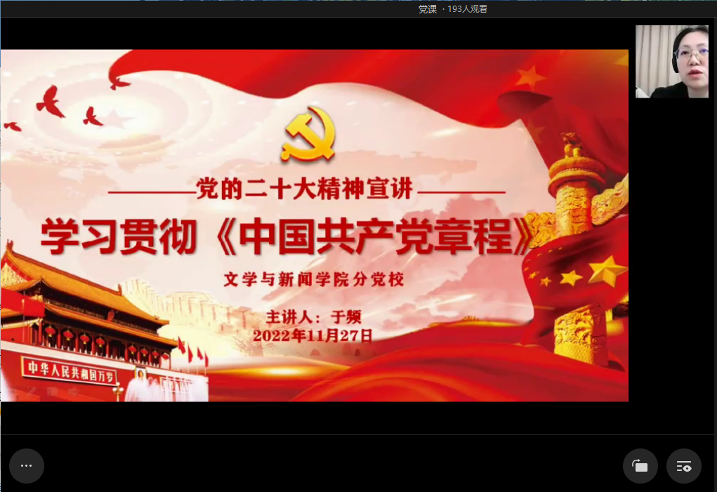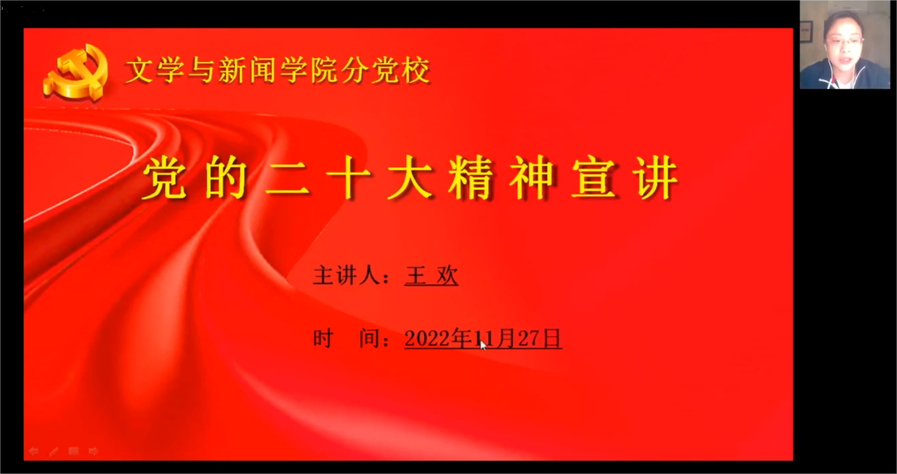 11月27日,为深入学习贯彻党的二十大精神,系统掌握新修改党章所体现的新理念、新思想、新战略,全面贯彻习近平新时代中国特色社会主义思想,文学与新闻学院分党校召开学习党的二十大精神专题党课宣讲。与会人员有文学与新闻学院全体本科学生党员和入党积极分子。专题党课宣讲由文学与新闻学院党委书记于频和组织员王欢主讲。