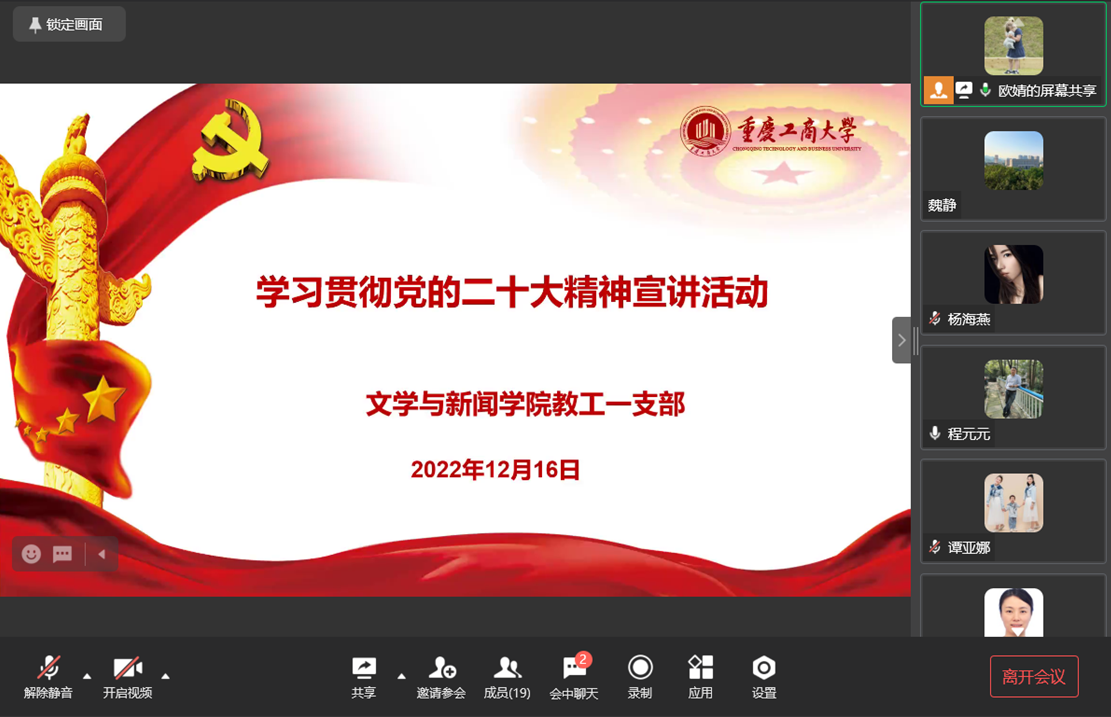 2022年12月16日,文学与新闻学院教工第一党支部在企业微信召开线上会议,开展学习贯彻党的二十大精神宣讲活动,由支部书记欧婧主持。