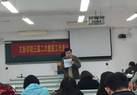 12月25日下午,文新学院三届二次教职工大会暨工会会员大会在90625教室召开。学院全体党政领导、全体教职工参加了大会。会议由党总支书记段庸生主持。