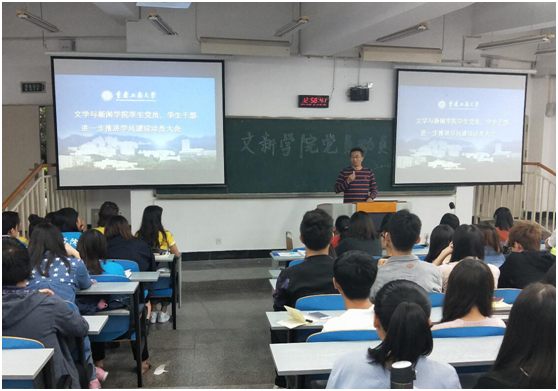 2017年9月29日中午,文学与新闻学院在慧智楼90226教室召开了“进一步推进学风建设动员大会”,学院党委副书记李华平、全体辅导员教师、学生党员、学生干部参加了此次大会。本次学风建设推进会是在迎接本科教学评估的大背景下召开的,目的是让学生党员、学生干部学习和了解此次本科教学评估的内容和意义,带头营造良好的学习氛围,进一步推进学院学风建设。