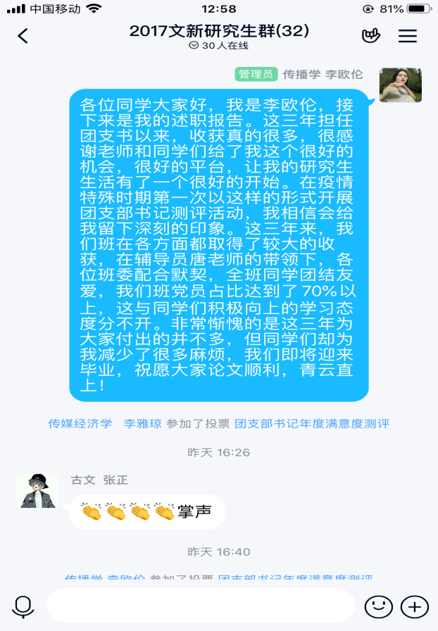 虽然此次工作通过线上的形式展开,但各支部尽心尽力完成,并展现了各支部特色。如18新媒体二支部充分利用互联网的优势,通过线上直播的方式进行团支书述职,各团员可在评论区随意发言,对团支部书记的工作进行点评以及提出相关建议,在最大程度上做到民主、公开、公正,在为大家服务的同时也接受着大家的监督。而16级临近毕业的各支部,尽管非常忙碌,但他们非常珍惜这次能够把大家聚在一起的机会,既有对过去一年工作的总结,同时也表达了对各位团员美好前程的祝愿,如16级汉文班王同学说道:“很感谢各位支部成员过去一年对我工作的支持,不管是团日活动还是收任何材料都积极配合,也希望在这个班级、在这个职位上能多留给你们一些美好的回忆,衷心祝愿各位前程似锦、顺顺利利……”。都说聚是一团火,散是满天星,各支部成员凝聚在一起,相互理解、互相帮助!