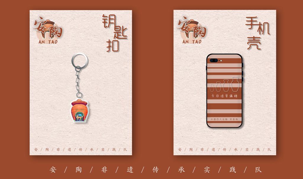 在线下实践的三天时间里,队员们用相机、手机以图片、视频等形式记录下了安陶小镇的古镇风韵以及学习制陶的整个过程。队员彭欣雨将图片、视频素材进行整合,制作出了适合线上短视频平台传播的荣昌陶宣传短视频。队长肖哲借助线下实践过程中拍摄的图片,设计制作出了原创荣昌安陶文化创意产品(手机壳、钥匙扣)。