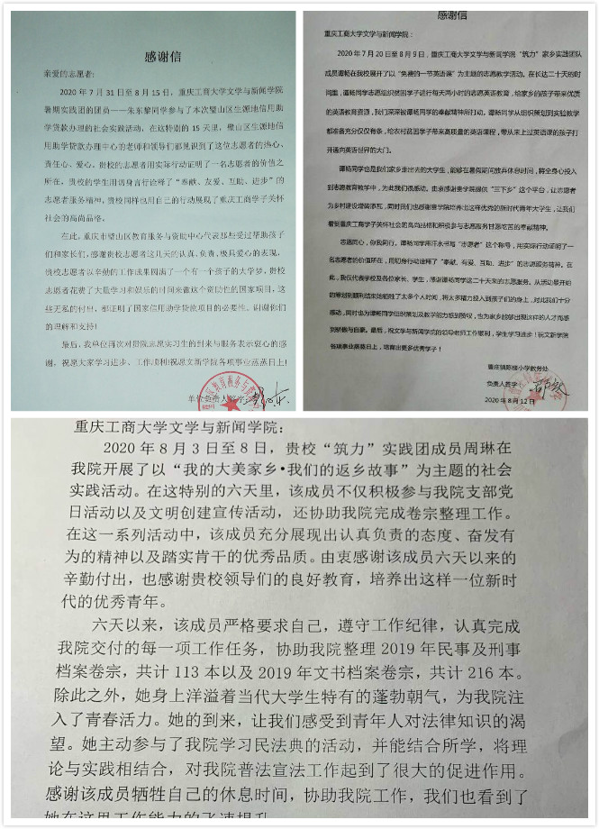 同时,我院收到了三封来自不同机构的感谢信,对在返家乡实践活动中表现优秀的18汉文1班周琳、19新闻谭畅,18网络新媒体2班朱东黎等三位同学进行了真挚的表扬与感谢,肯定了我院学生在实践活动工作中发挥的重要作用和作出的贡献。