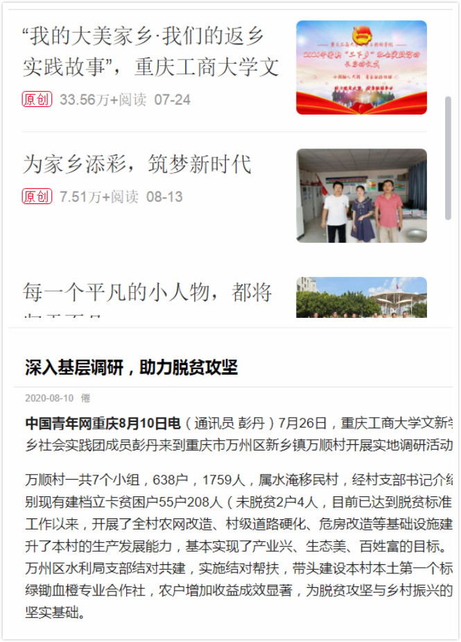 目前,学院暑期社会实践活动已进入收尾阶段,截至8月23日,上游新闻共刊登51篇我院学生优质社会实践故事作品,单个新闻阅读量达33.55万,中国共青团杂志微博、人民网重庆频道、华龙网、中青网、今日头条、彭水网等媒体均对我院学生在社会实践中的感人故事进行了报道。
