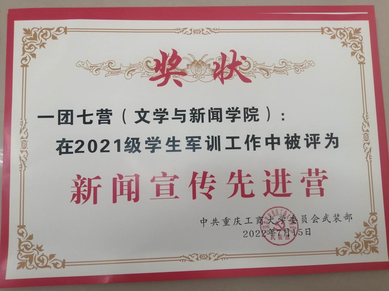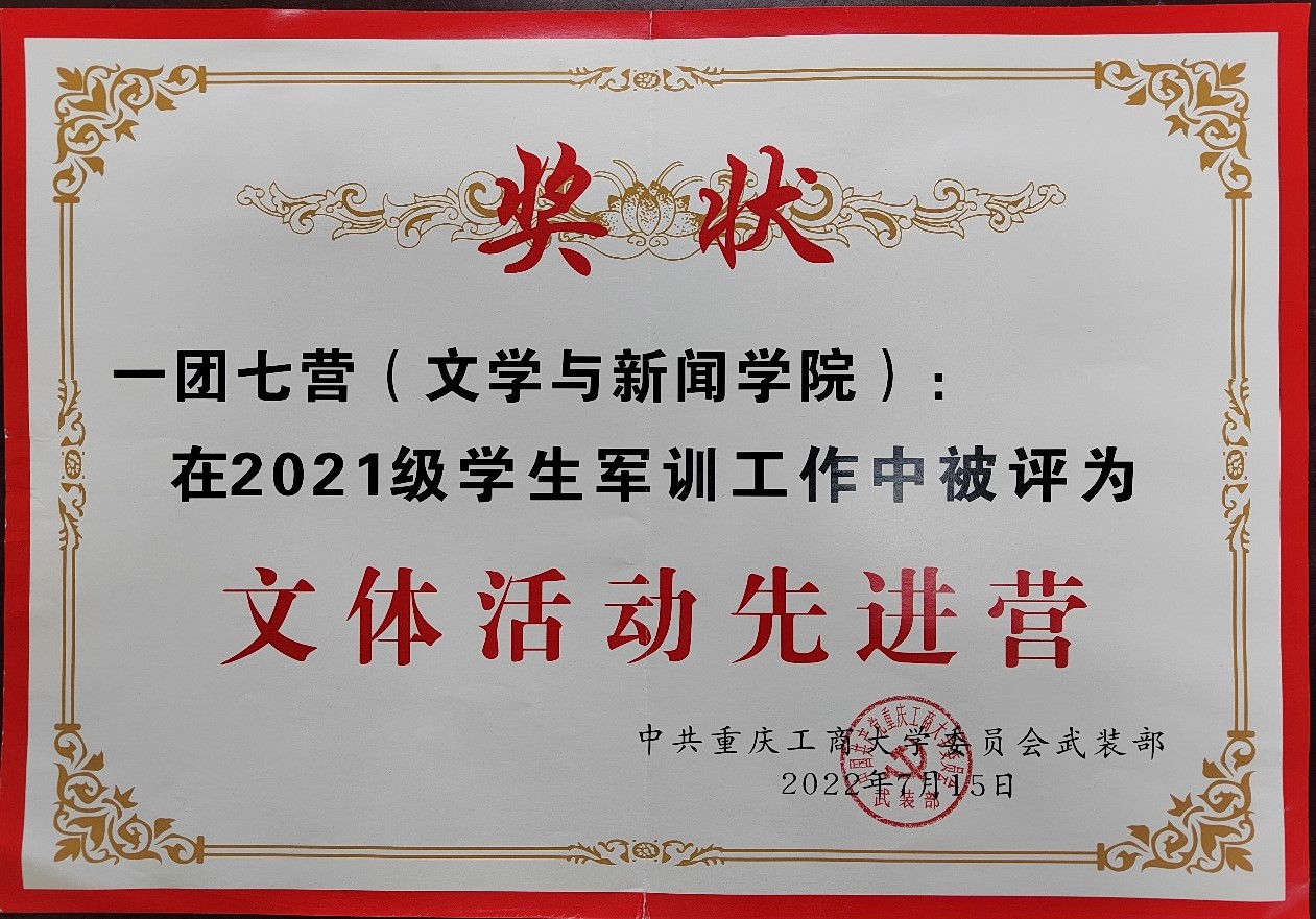 激情昂扬挥洒汗水,拼搏进取释放青春。7月15日上午重庆工商大学2021级学生军训总结表彰大会在南岸校区南区操场隆重举行。在学院领导的高度重视,教官的严格要求和同学们的不懈努力下,文学与新闻学院所属一团七营在2021级学生军训工作荣获“先进营”、“文体活动先进营”、“新闻宣传先进营”等荣誉称号,其中我院七营三连被评为先进连队。