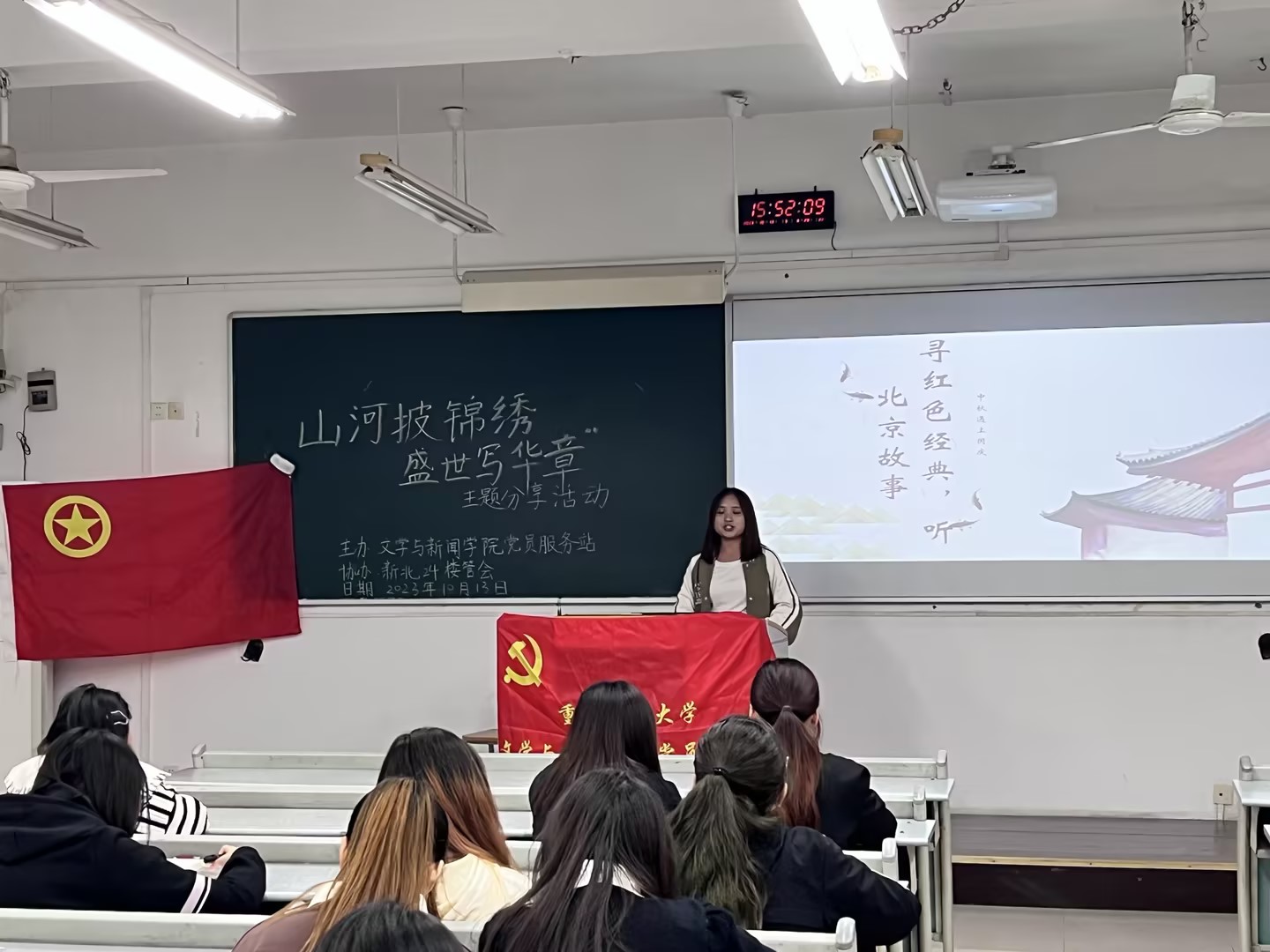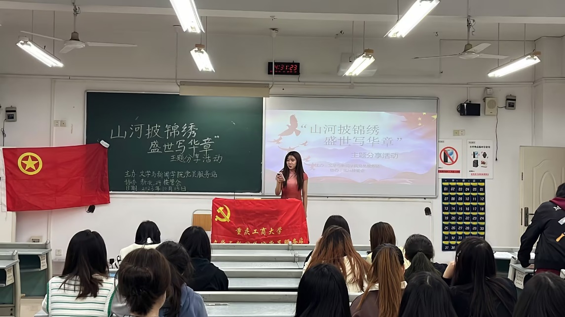 金秋十月,共迎双节。文学与新闻学院党员服务站于10月13日下午两点在慧智楼90225举办了以"山河披锦绣,盛世写华章"为主题的线下分享活动,成员们积极参加,乐在其中,以己之口讲述中国故事,以己之力书写盛世华章。