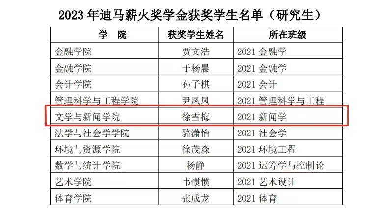 依据《重庆工商大学“迪马·薪火”奖学金评选办法》,经学生个人申请、各学院推荐申报、学生处审核、“迪马·薪火”奖学金考评小组面试评审,最终评选出20名本科学生和10名研究生荣获2023年“迪马·薪火”奖学金。其中,我院22级新闻学本科生韩书睿、沙小琼,21广告学本科生陈文涛,以及21级新闻学研究生徐雪梅荣获此次奖学金。