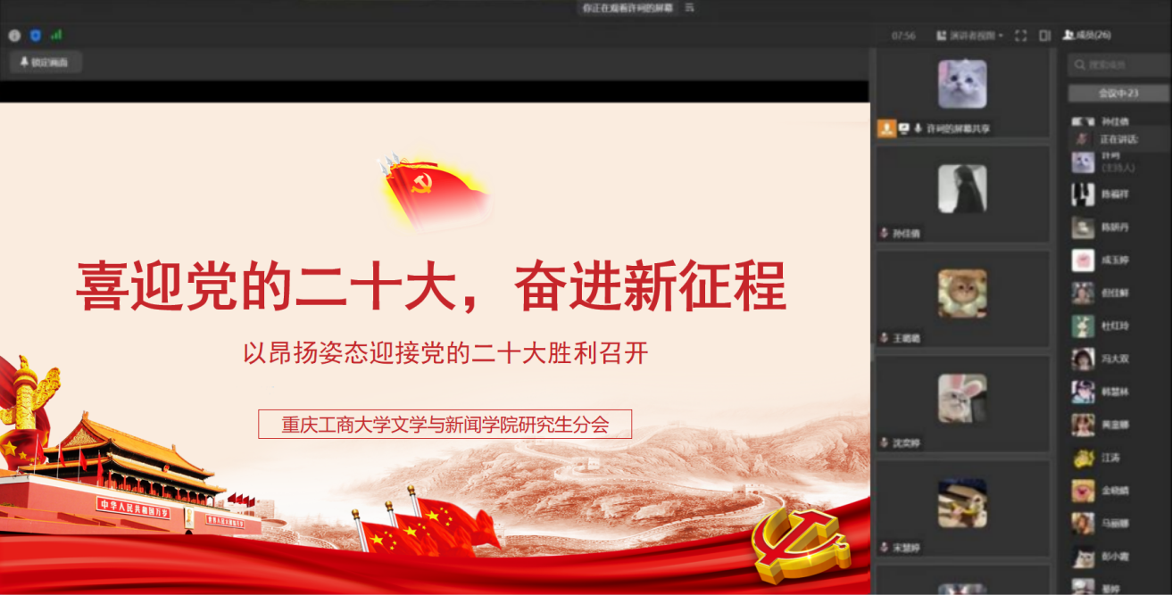 2022年10月16日上午,为更好学习落实党的二十大精神,文学与新闻学院研究生分会全体成员在线上认真收听收看党的二十大开幕会。讨论会由研分会副主席许珂主持,指导老师唐玉星全程参与讨论会议。