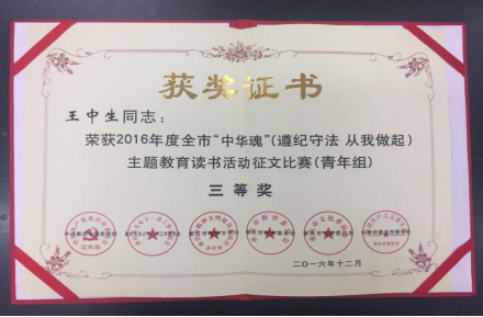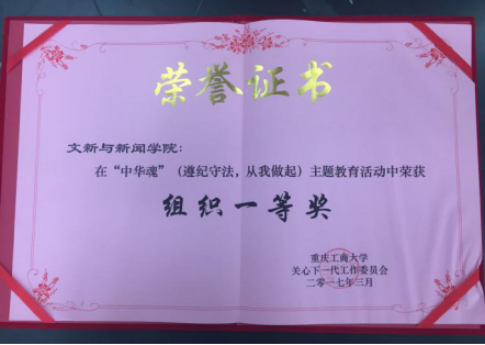 为深入贯彻十八大四中、五中全会精神和习近平总书记系列讲话精神,引导青年师生学法、知法、守法、遵法、帮助青年学生树立法治意识,增强法治观念,提高法治素养,重庆市委宣传部、重庆市关工委等部门联合举办了“中华魂”(遵纪守法、从我做起)读书活动暨征文、演讲比赛。文新学院共有36名同学参与了本次活动,其中2014级广告二班王中生同学的作品荣获2016年度全市“中华魂”(遵纪守法、从我做起)主题教育读书活动征文比赛(青年组)三等奖,李单等15名同学荣获相应的校级奖项;我院辅导员肖婷、王涛、张小焕老师荣获2016年大学生“中华魂”主题教育活动优秀辅导员荣誉称号;文学与新闻学院获得组织一等奖。