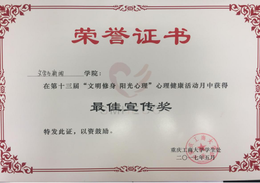 该活动极大地促进学校的心理健康教育工作,为营造良好的心理健康氛围起到了积极的宣传作用。由此,我院也获得了“最佳宣传奖”的荣誉证书。