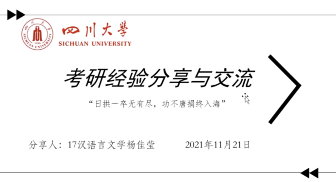 “日拱一卒无有进,功不唐捐终入海”,就读于四川大学研究生的校友杨佳莹鼓励同学从时间计划和备战计划两方面分享了考研经验,她提醒同学们尽早为自己设定从日到月的学习的计划,重视规划好考试科目的复习时间,掌握学习进度、提高学习效率。