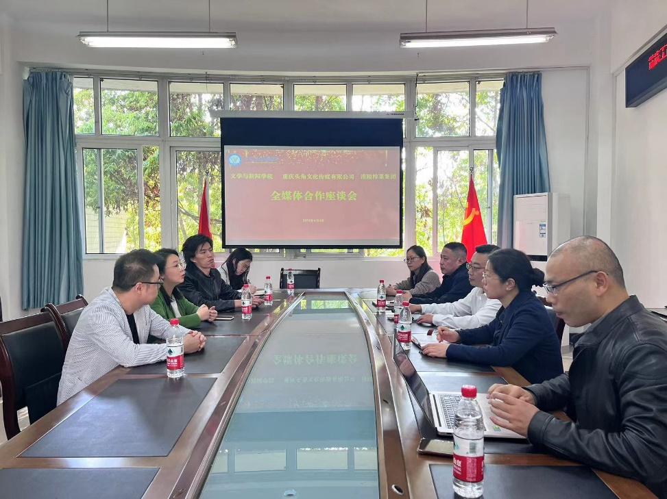 4月4日下午,我院与重庆头角文化传媒有限公司、涪陵榨菜集团在90528会议室开展了全媒体合作座谈会。学院全体党政领导、系主任代表、重庆头角文化传媒有限公司总经理皮睿、涪陵榨菜集团全媒体运营总监刘敏等参加了座谈会。会议由院长殷俊主持。