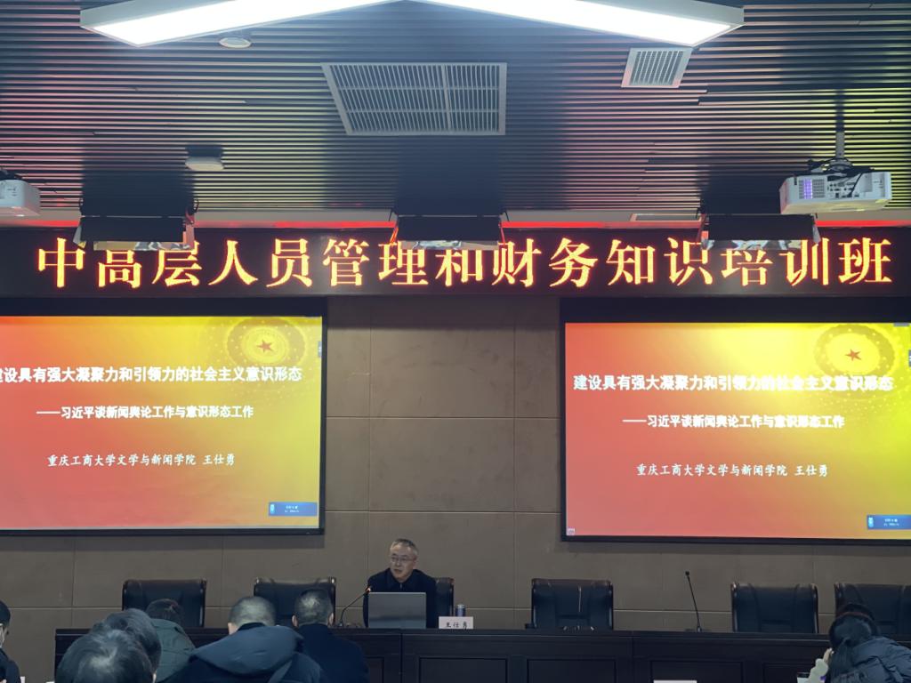2021年12月4日,文学与新闻学院在图书馆多功能厅举办了中科普集团中高层人员管理和财务知识培训班。388vip太阳集团院长王仕勇教授、重庆中科普传媒发展股份有限公司党委副书记、总经理郭定平以及中高层人员管理和财务知识培训班全体学员参加了此次培训班。